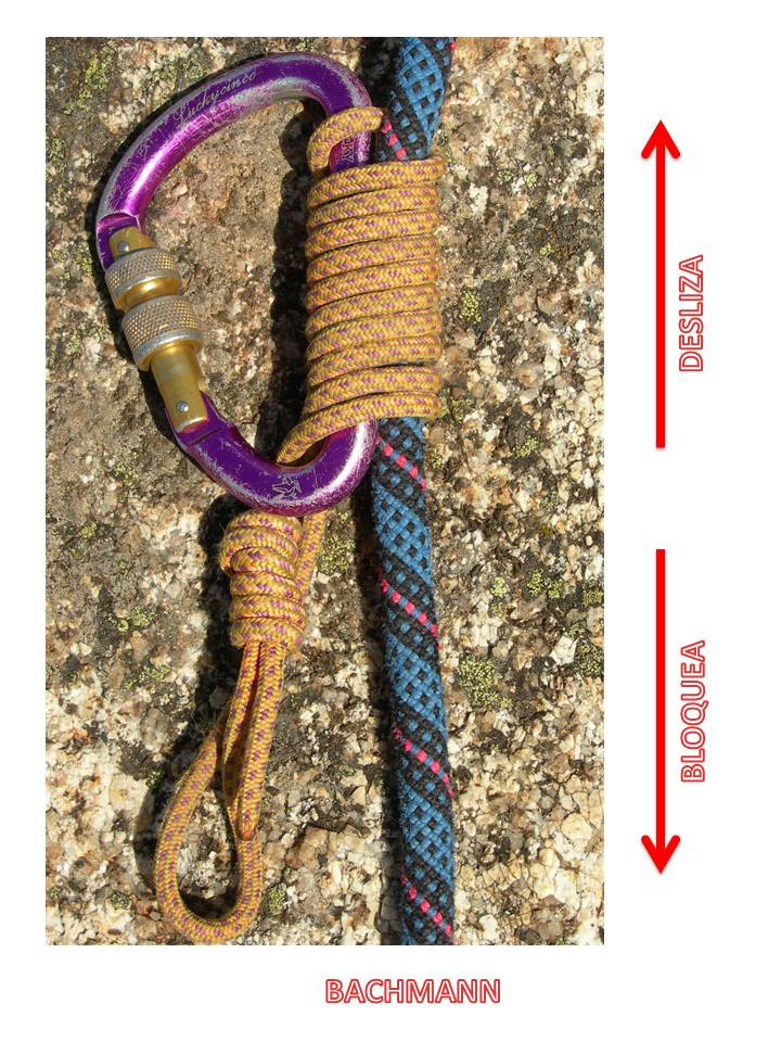 Para realizar este nudo unidireccional es necesario el uso de un mosquetón que nos permitirá moverlo de manera muy cómoda. Debemos dar 4 vueltas como mínimo a lo largo del eje del mosquetón y si queremos aumentar su efecto de bloqueo basta con añadirle vueltas. Para anclaros a él debemos hacerlo del seno que queda libre una vez ha pasado por el interior del mosquetón.